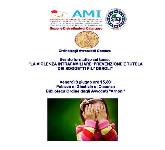 “La violenza intrafamiliare: prevenzione e tutela dei soggetti deboli” è il tema del convegno che si terrà il prossimo venerdì 8 giugno, alle ore 15.30, presso la Biblioteca Arnoni del Palazzo di Giustizia di Cosenza. L’evento info-formativo è organizzato dalla Sezione Distrettuale di Catanzaro dell’AMI, Associazione Avvocati Matrimonialisti Italiani, con il patrocinio dell’Ordine degli Avvocati di Cosenza e del SIULP della provincia di Cosenza. Parteciperanno all’evento: l’avvocato Gian Ettore Gassani, presidente nazionale AMI; l’avvocato Margherita Corriere, presidente della Sezione AMI del Distretto di Catanzaro; il Sostituto Procuratore della Repubblica presso il Tribunale di Cosenza, Domenico Frascino; l’avvocato Vittorio Gallucci, presidente del Consiglio dell’Ordine degli Avvocati di Cosenza; l’ispettore di Polizia Luciano Lupo, segretario provinciale del SIULP.