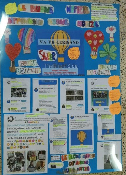 Coinvolgente andare a caccia di buone notizie. Gli alunni, giovani cronisti, Salgari in erba, piccoli Verne e fantastici Calvino per la creatività messa in atto in tutti gli elaborati. Le buone notizie sono state ricercate online grazie ad un lavoro di brainstorming sul tema scelto da The Brightside, l’ecologia e, per volontà degli insegnanti, Agenda 2030. I ragazzi hanno letto e scelto notizie postate da molte testate locali, nazionali e internazionali, provenienti, tra gli altri siti, da WWF, LEGAMBIENTE GREENREPORT. Ogni alunno ha poi portato in classe le notizie e discusse in gruppo: un cooperative learning positivo e aggregante. Le news hanno trovato posto nella positivitybox e, infine, sono state riassunte e narrate non solo attraverso la scrittura sintetica d l’esposizione orale ma anche tramite la traduzione creativa e fantastica che ciascun alunno ha progettato. Un approccio per competenze cadenzato dalle infinite possibilità relazionali e comunicative offerte dai socialmedia: la registrazione dei brigthTG, la produzione di didascalie chiare e pertinenti rispetto ad una fotografia postata, il timbro espositivo forte e chiaro nella registrazione per Radio24.