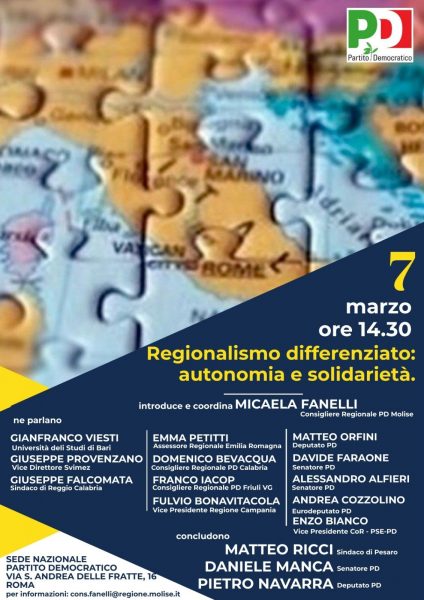 “È stata per me una giornata particolarmente gratificante ed emozionante. Ieri, a Roma, al seminario nazionale sul regionalismo differenziato, è stato, infatti, evidenziato e riconosciuto il lavoro svolto sul tema dal sottoscritto durante questi mesi. Non ho remore nell’affermare che il mio intervento ha, altresì, permesso di rompere un certo “ecumenismo” e un eccessivo “ammorbidimento” che stavano caratterizzando il dibattito: ho denunciato le responsabilità passate e recenti del gruppo dirigente nazionale del Pd, la sua mancanza di visione organica del Paese e il suo appiattimento sugli egoismi nazionali e territoriali interpretati e rappresentati dalla Lega”.
