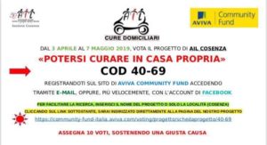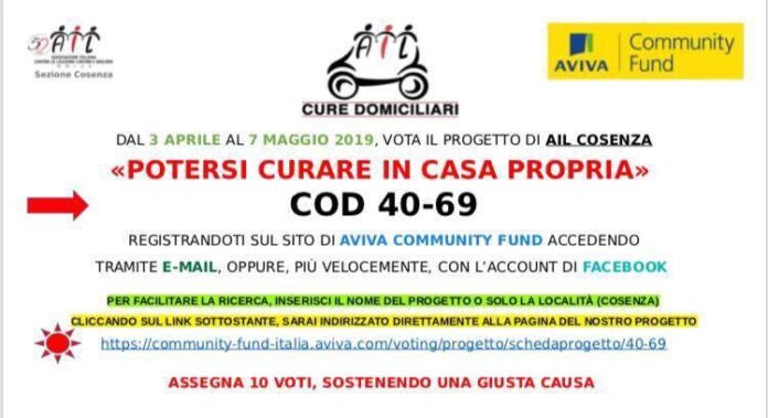 Il progetto candidato dall’Ail Cosenza dal titolo “Potersi curare in casa propria” è stato approvato dall’Aviva Community Fund nell’ambito della quarta edizione indetta dal gruppo assicurativo per dare la possibilità alle organizzazioni no profit di ricevere sostegno economico per una causa importante nella comunità.
