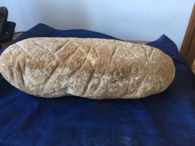 Il manufatto, contenente alcune lettere incise, si presenta con alcuni segni impressi sulla roccia coperti da una patina rossiccia.