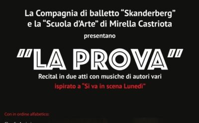 Mercoledì 12 giugno, alle ore 20.30, esordirà “La Prova”, sul palco del Teatro Garden di Rende. Un esperimento nuovo per la scuola d’arte di Mirella Castriota e la compagnia di balletto Skanderberg, una fusione tra vari musical e una produzione di qualche anno fa firmata dalla stessa Skanderberg: “Si va in scena lunedì”. L’obiettivo è quello di creare uno spettacolo in cui convivano sul palco recitazione, danza e canto. La sceneggiatura, la recitazione e le coreografie musical sono di Francesco Mastroianni che ha curato anche la regia insieme a Luca Ziccarelli.