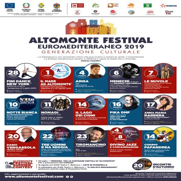Prende il via la trentaduesima edizione del Festival Euromediterraneo di Altomonte. L’edizione 2019 ha come tema la “Generazione culturale” e sarà caratterizzata da un sentito omaggio al Maestro Andrea Camilleri da poco scomparso. La sessione estiva del festival andrà avanti sino al 14 settembre.