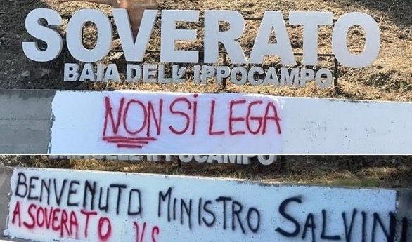 Ma anche in terra calabrese, Salvini ha dovuto fare i conti con il dissenso. E se a Le Castella si è potuto concedere “dieci minuti di relax in acqua senza telecamere e giornalisti”, a Soverato i contestatori non ci sono andati tanto per il sottile. Al suo arrivo in spiaggia il ministro senza ministero è stato accolto da striscioni e cori di dissenso. Momenti puntellati da attimi di tensione tra sostenitori e manifestanti a bordo palco, che hanno richiesto l’intervento della polizia in tenuta anti sommossa. Durante l’accesa performance il mattatore padano ha dovuto interrompere il discorso a causa di un black out sul palco. «Il cretino che ha danneggiato l’impianto audio – ha dichiarato serafico Salvini rassicurando la folla – è stato bloccato e identificato dalle forze dell’ordine».