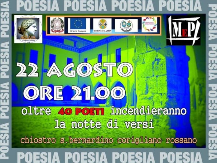 Grande attesa per l’irruzione del MEP, Movimento (Internazionale), per l’Emancipazione della Poesia coinvolto per l’occasione. Le melodie saranno a cura del Maestro Saverio Schettini. L’evento, patrocinato dal Comune di Corigliano Rossano, in collaborazione con la Rete Turistica, ha lo scopo di risvegliare le coscienze attraverso il messaggio della Poesia, come forma di letteratura e linguaggio capace di suscitare emozioni e sensibilizzare il pensiero contemporaneo sui mali del nostro tempo.