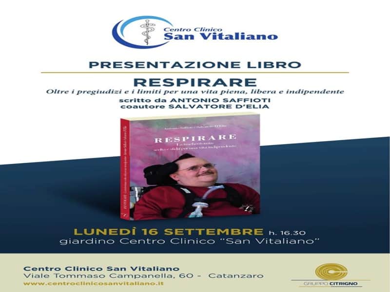 Oltre i pregiudizi e i limiti, per una vita piena, libera e indipendente”. È questo il messaggio del libro “Respirare”, scritto da Antonio Saffioti e Salvatore D’Elia, edito da Grafichèditore di Antonio Perri, che sarà presentato a Catanzaro lunedì 16 settembre, alle ore 16:30, nel parco del Centro Clinico San Vitaliano, promotore dell’evento. Durante l’incontro è prevista la lettura di passi rappresentativi del libro, a cura del doppiatore Attilio Mela.