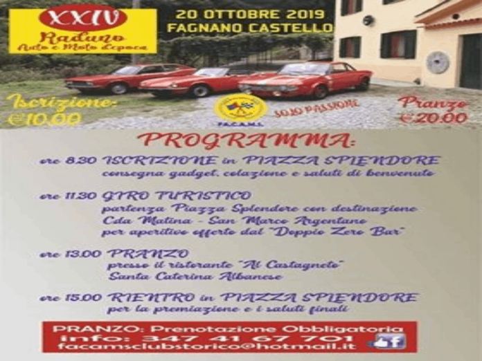 Passione. Solo passione. Per lo sport. Per la storia motoristica italiana nel mondo. Sono questi i motivi che animano da sempre la FACAMS di Fagnano Castello (CS) che ha organizzato domani, domenica 20 Ottobre 2019 il XXIV raduno di auto e moto storiche.