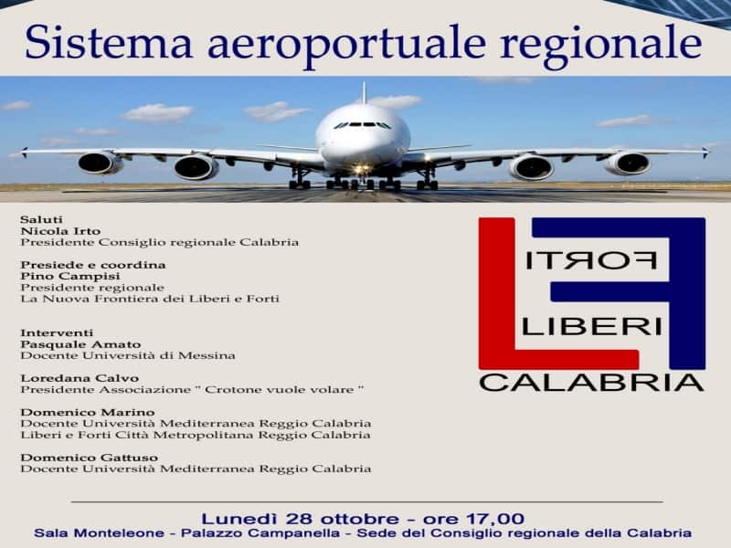 La Nuova Frontiera di Liberi e Forti di Calabria, dopo la tappa di Lamezia Terme, ritorna sul tema del “Sistema Aeroportuale Calabrese” e lo ripropone nella città metropolitana di Reggio Calabria, lunedì 28 ottobre, alle ore 17.00, presso la Sala Monteleone del Consiglio Regionale della Calabria.