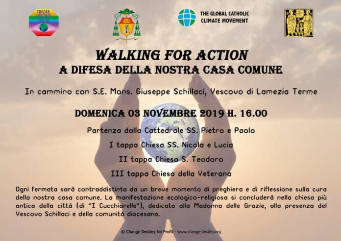 In linea con l’Enciclica Laudato Sì e come azione concreta per la Difesa della nostra Casa Comune, la Change Destiny No Profit, il Global Catholic Climate Movement e la Diocesi di Lamezia Terme, Vi invitano numerosi alla prima edizione della manifestazione ecologico-religiosa “Walking for Action”, l’evento di azione per il clima fissato per domenica 03 novembre alle h. 16, con partenza dalla Cattedrale SS. Pietro e Paolo e arrivo alla storica Chiesa della Veterana, la più antica della città.