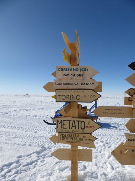 Angelo Domesi, il nome del ricercatore. Il cartello è stato messo alla base italo-francese Concordia sul plateau antartico.