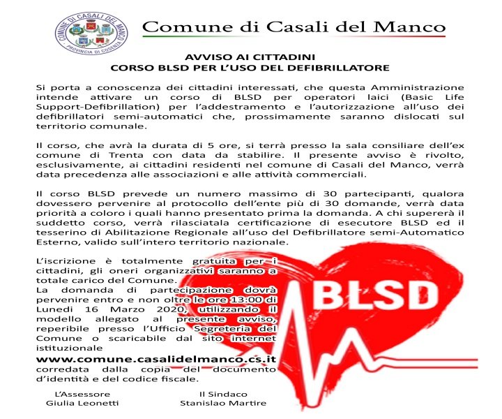 Casali del Manco si doterà di defibrillatori semi- automatici da dislocare sul territorio comunale. Strumenti salvavita in caso di arresto cardiaco. L’amministrazione al fine di rendere operativo il servizio intende attivare un corso di BLSD per operatori laici (Basic Life Support – Defibrillation) addestrati e autorizzati all’uso del dispositivo.