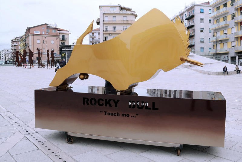 L’opera si chiama “Rocky Bull” ed è una scultura itinerante in Cor-ten (ferro acciaioso che ha una componente importante per resistere a lungo contro le intemperie) con verniciatura d’oro e che misura 3 metri per 3,4. Ne è autore Salvador Gaudenti, artista argentino, nativo di Buenos Aires, da genitori calabresi (il padre e la madre erano originari di Saracena ed il nonno paterno di Rende) che avevano seguito il flusso migratorio verso l’Argentina impoverita dall’ultimo conflitto mondiale.