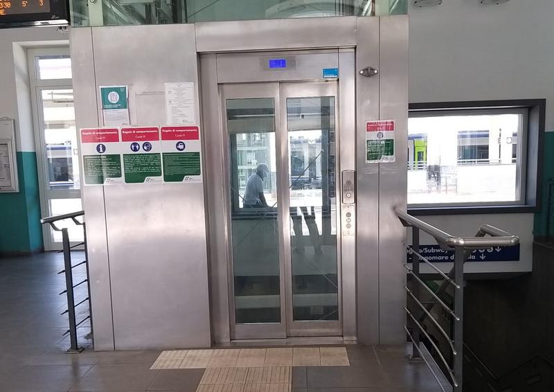Realizzati da Rete Ferroviaria Italiana (Gruppo FS Italiane), permettono un comodo accesso dall’atrio della stazione ai binari del secondo e terzo marciapiede. Di nuova generazione, con telecamere esterne e interne per garantirne la videosorveglianza, possono portare fino a otto persone e sono in funzione dalle ore 6.00 alle 22.00.