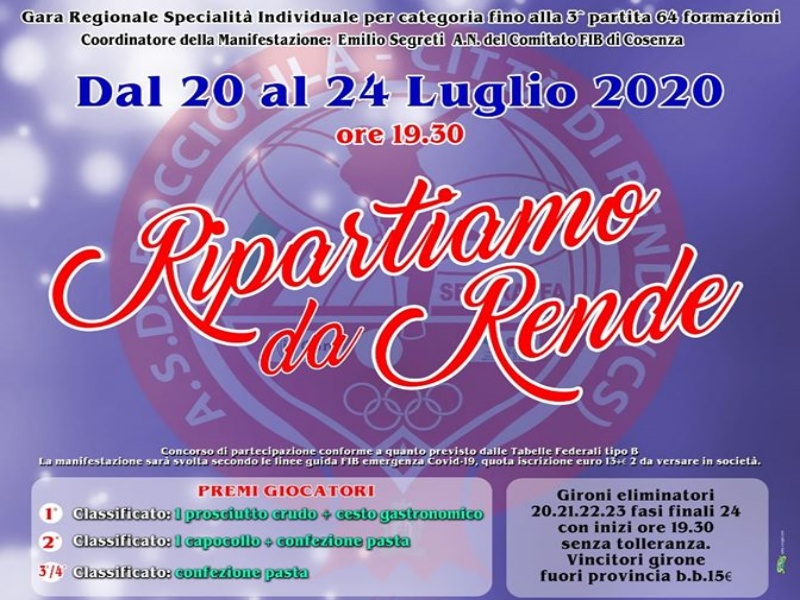 Si terrà a Rende (CS) dal 20 al 24 luglio la prima gara regionale in Calabria del post-lockdown. Promotori dell’iniziativa – gara individuale per categoria fino alla terza partita – l’A.s.d. Bocciofila Città di Rende ed il Comitato Provinciale FIB Cosenza (recentemente mutato nella figura del solo delegato).