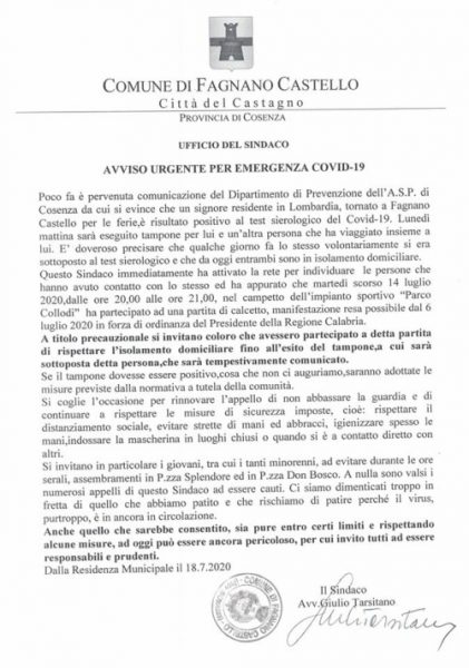 Un’altra persona risultata positiva al Covid-19 a Fagnano Castello, in provincia di Cosenza. A renderlo noto è il sindaco della cittadina Giulio Tarsitano che posta sulla pagina Facebook del comune la comunicazione avuta dal dipartimento Prevenzione dell’Asp di Cosenza, «da cui si evince che un signore residente in Lombardia, tornato a Fagnano Castello per le ferie, è risultato positivo al test sierologico del Covid-19».