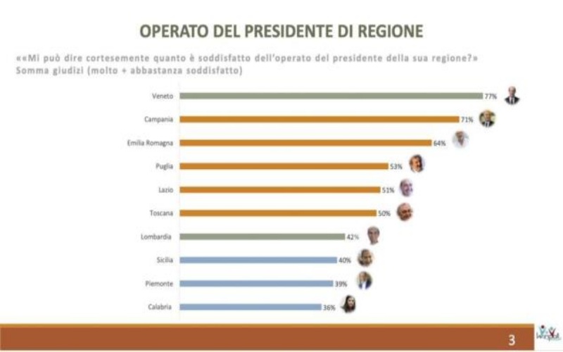 Al primo posto del podio Luca Zaia con il 77% dei Veneti che si dichiarano molto o abbastanza soddisfatti del suo operato. A seguire il governatore della Campania De Luca (71%) e quello dell’Emilia Romagna Stefano Bonaccini (64%). Giudizi positivi anche per Michele Emiliano (53%), Nicola Zingaretti (51%) e Enrico Rossi (50%).