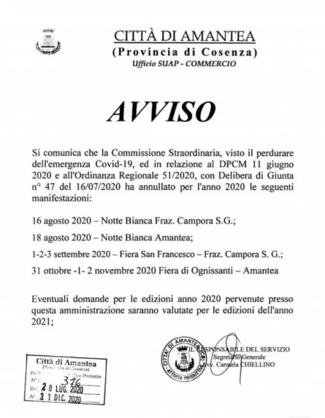 Sospese le tradizionali notti bianche a Campora e Amantea: il perdurare dell’emergenza Covid-19 ha fatto si che la Commissione Straordinaria fosse costretta ad annullare le manifestazioni.