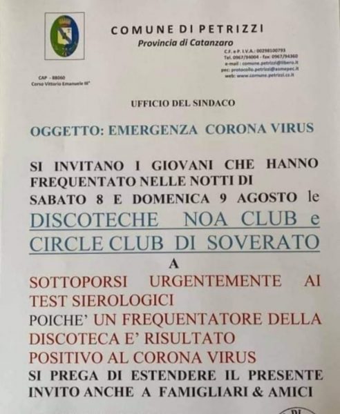 A seguito della vicenda di Soverato il dipartimento di Vibo ha deciso di disporre tamponi a tappeto in numerosi centri della provincia nei confronti di chi ha preso parte alle serate in discoteca a Soverato tra sabato 8 e domenica 9 agosto 2020. Anche i sindaci (in foto l’ordinanza emanata dal primo cittadino di Petrizzi) stanno invitando i concittadini che fossero stati in quelle date nei locali del litorale catanzarese a comunicarlo con urgenza alle autorità sanitarie in modo da predisporre le dovute precauzioni ed eventuali tamponi.