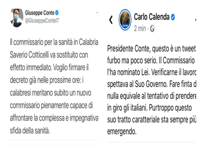 Calenda replica al messaggio di Conte: “Presidente Conte, il suo è un tweet furbo ma poco serio. Il commissario l’ha nominato lei. Verificarne il lavoro spettava al suo Governo. Fare finta di nulla equivale al tentativo di prendere in giro gli italiani. Purtroppo questo suo tratto caratteriale sta sempre più emergendo.”