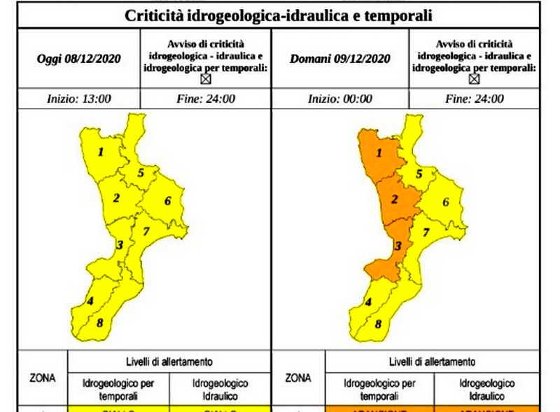 La Protezione Civile ha diramato per domani, mercoledì 9 dicembre, un’allerta meteo arancione per i settori dell’alto tirreno e allerta gialla per gli altri settori della Calabria.