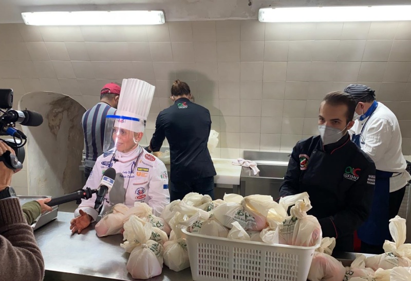 Alla Vigilia del Santo Natale, presso la Mensa dei Poveri “Padre Pio” di Crotone, a conferma del necessario e crescente sostegno da rivolgere verso quanti devono sopravvivere tra mille difficoltà, adesso scatenatesi anche a seguito della crisi economica e sociale generata dal Covid, per andare incontro alle esigenze quotidiane di molte famiglie bisognose e per dar voce e continuità alle azioni missionarie di carità e solidarietà sociale, la Delegazione del Sacro Militare Ordine Costantiniano di San Giorgio di Crotone, con il fattivo apporto dell’azienda crotonese Stagionello Food Factory e con il contributo dell’Associazione Cuochi San Giovanni in Fiore, alla presenza di don Ezio Limina, dei Cavalieri dell’Ordine Costantiniano, Alessandro Cuomo, Antonio Oliverio e Nicola Oliverio, degli chef della Federazione Italiana Cuochi, Patrizia Cosentini, Gaetano Mellino, Alessandro Antolini, e del delegato aziendale della Stagionello, Antonio Cuomo, ha consegnato un pentolone professionale da utilizzare nelle cucine della struttura, così da poter soddisfare le aumentate esigenze di preparazione del cibo, e 120 pasti ai poveri della città a base di pregiatissima carne maturata, con hamburger di ottima qualità e dall’alto valore nutraceutico, accompagnati da una vellutata di zucca in panini prodotti con farine locali.