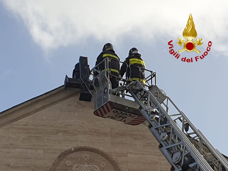 Intervento dei vigili del fuoco è valso al recupero della croce che, divelta dal vento era in pericolo di caduta. I vigili del fuoco hanno altresì verificato la stabilità di ulteriore Croce posta sul Campanile. La Croce recuperata è stata consegnata al parroco e posizionata all’interno della chiesa.