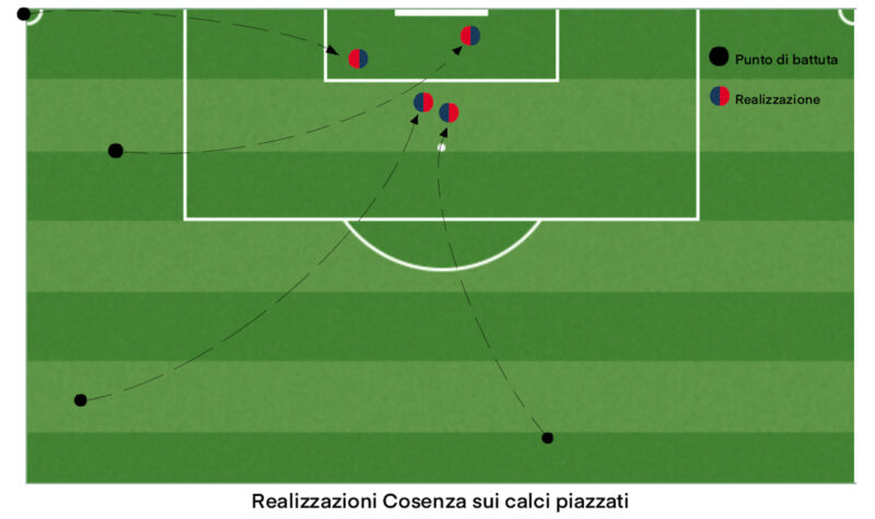 il Cosenza, invece, rispetto ai marchigiani risulta più pericoloso nella costruzione dei calci piazzati; la formazione di Occhiuzzi, infatti, non ha mai messo a referto un gol diretto su punizione prediligendo la ricerca dei saltatori in area, ma sono solo quattro le realizzazioni scaturite da traversoni su calci piazzati (troppo poche per quante volte la palla viaggia all’interno dell’area avversaria).