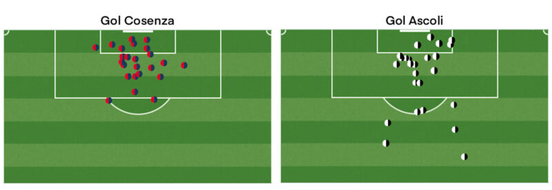 Ciò che dà più all’occhio è il 3.8 della media gol a partita per due formazioni che navigano negli abissi delle realizzazioni (24 per i rossoblù e 25 per i bianconeri). Sia Cosenza che Ascoli, dunque, creano tanto, ma sprecano altrettanto in fase di finalizzazione. I calabresi prediligono lunghi giro-palla e manovre orchestrate, molto spesso fini a se stessi, nel tentativo di scardinare le difese avversarie, mentre i marchigiani non rinunciano a qualche conclusione in più al di fuori dell’area di rigore, mantenendo comunque una media gol molto bassa.