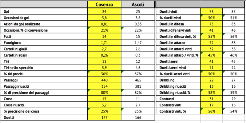 Analizzando i dati forniti dalla piattaforma InStat, non sorprende il solo punto di differenza tra i Lupi e i Picchi (molto simili anche i dati della Reggiana); dopo trenta giornate disputate le squadre si equivalgono per la maggior parte dei dati, dalla media occasioni gol a partita (3.8 per entrambe) alla percentuale di duelli vinti (50% per i rossoblù e 51% per i bianconeri); dalla media ammonizioni (2.7 e 2.6) a quella delle espulsioni (media leggermente maggiore per l’Ascoli che registra 0.3 in confronto allo 0.26 del Cosenza).