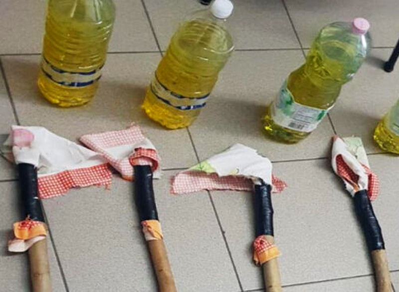 Dopo una serie di accurati controlli è scattato il controllo domiciliare presso l’abitazione dei due giovani, dove i militari hanno rinvenuto un piccolo arsenale composto da vere e proprie bottiglie incendiarie: rivenute 4 bottiglie da due litri colme di benzina, assieme ad altrettanti bastoni in legno da usare come inneschi, già dotati di “cappuccio” in stoffa per appiccare il fuoco.