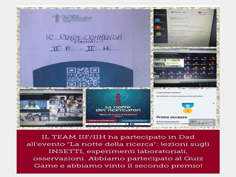 In classe, dalle ore 11.00, i giovani alunni, il team degli insegnanti e la Dirigente Rosalba Borrelli hanno partecipato, in streaming, alla cerimonia di celebrazione dell’edizione 2020 della Notte dei Ricercatori SuperScienceMe, evento, durante il quale il gruppo classe ha ricevuto la comunicazione relativa alla vincita del secondo premio per aver partecipato al Quiz Game condotto nel mese di novembre in didattica a Distanza.