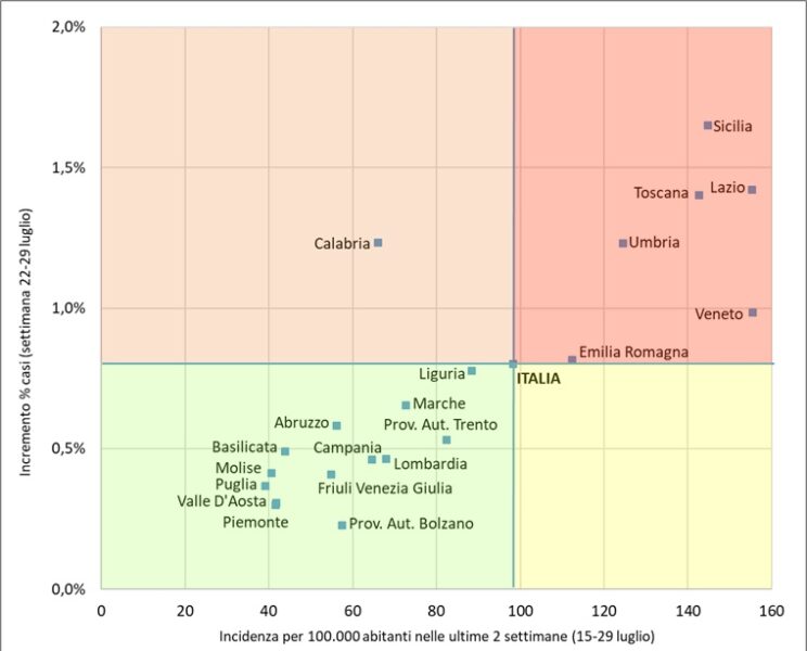 Nel report di Gimbe appare la Calabria tra le Regioni con valori inferiori alla media nazionale per nuovi casi per 100.000 abitanti nelle ultime due settimane.