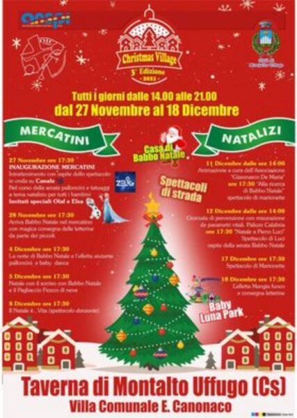 Non ci resta altro che visitare il “CHRISTMAS VILLAGE 2021” di Taverna di Montalto Uffugo (CS), che sarà inaugurato sabato 27 Novembre alle 17:30 presso la Villa Comunale E. Canonaco. Resterà aperto fino al 18 Dicembre 2021, tutti i giorni dalle 14:00 alle 21:00. Vivi la magia del Natale!