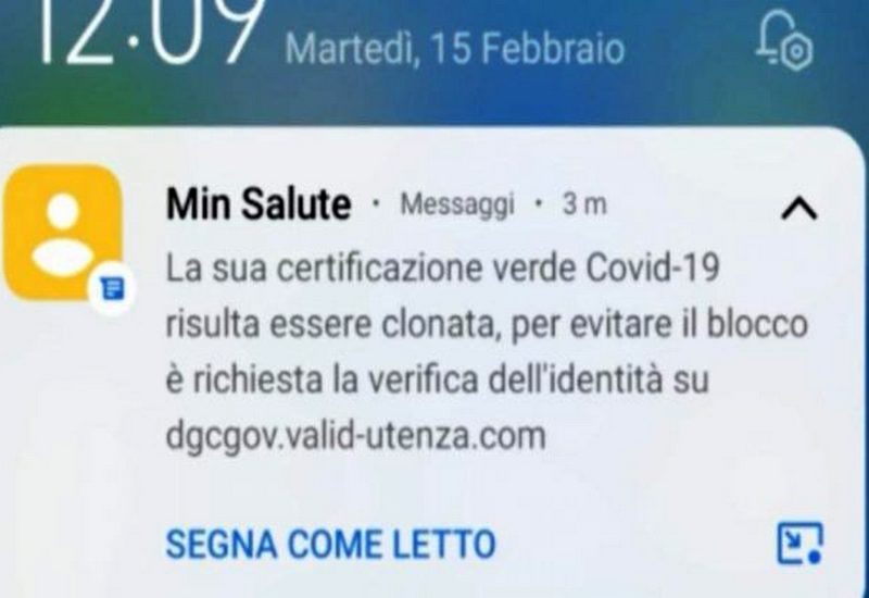 Nel falso messaggio si legge che «la sua certificazione verde Covid-19 risulta essere clonata, per evitare il blocco è richiesta la verifica dell’identità su dgcgov.valid-utenza.com».