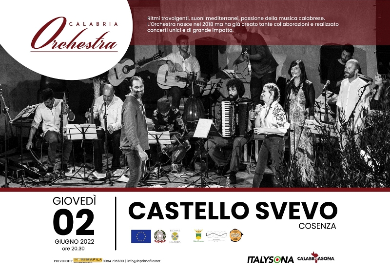 Tutto pronto per questa sera: alle ore 20.30, nel giardino del Castello Svevo di Cosenza, sarà presentato in concerto “Calabria Orchestra Live” (Italysona – Calabria Sona), che prende spunto dal primo lavoro discografico della formazione che riassume quattro anni di intensa storia musicale e contiene i brani che più ne hanno caratterizzato il percorso artistico.