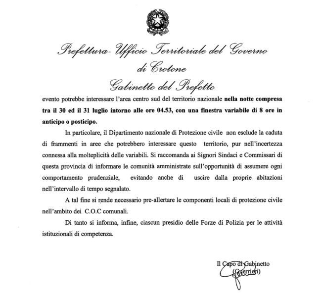 “Si informano i cittadini che la Prefettura di Crotone ha diramato una nota, che si allega, ad oggetto: “rientro incontrollato nell’atmosfera terrestre del secondo stadio del vettore cinese PRC CZ5B “.