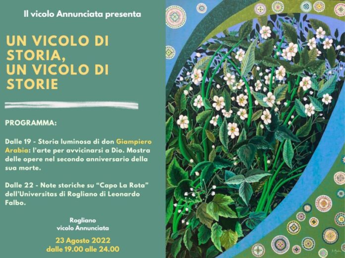 Il Vicolo Annunciata continua con le sue iniziative e durante il doppio appuntamento del 23 agosto 2022 la rassegna sarà aperta con la mostra del grande maestro mosaicista don Giampiero Arabia. Il fratello Francesco Arabia, che ha lavorato con lui e ne ha raccolto l’eredità, porterà in mostra i quadri in olio su tela e acrilico su tela di Don Giampiero dal 1980 agli ultimi anni. Sarà un modo per raccontare una storia luminosa di un