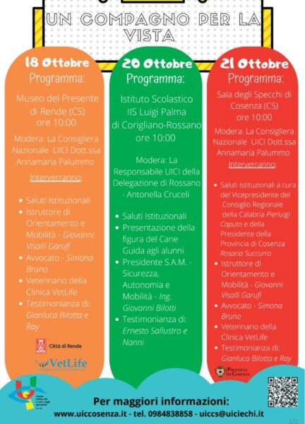 I cani che diventano gli occhi di chi non può vedere, è questo il tema dei tre incontri organizzati dall’Unione Italiana Ciechi ed Ipovedenti di Cosenza a sottolinearne l’importanza e l’istituzione di una “Giornata nazionale del cane guida” che, ogni 20 ottobre, serve a riportare l’attenzione su un tema il più delle volte tenuto al margine.