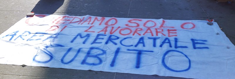 Esposti striscioni con slogan e richieste di avere uno spazio per poter vendere i loro prodotti alimentari.