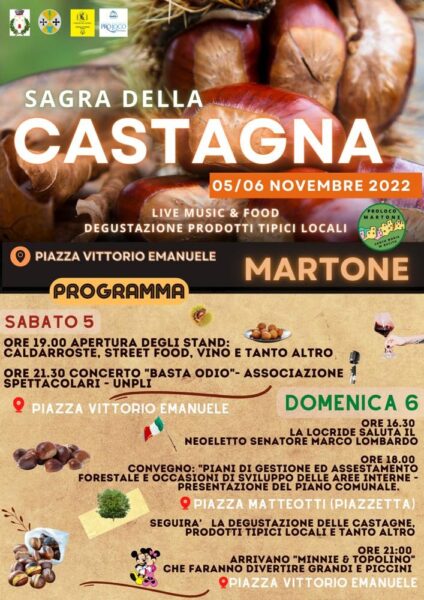 Sabato 5  e domenica 6 novembre 2022 si terrà a Martone (RC) la grande e rinomata Sagra della Castagna con i tanti ottimi prodotti dell’enogastronomia locale e l’artigianato.