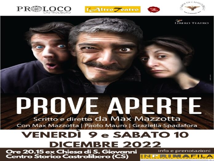 Oggi, venerdì 9 dicembre alle ore 20.15 e in replica domani sabato 10 dicembre, stesso orario, “PROVE APERTE” Scritto e diretto da Max Mazzotta, con Max Mazzotta; Paolo Mauro, Graziella Spadafora. Prove Aperte è una commedia brillante che racconta le vicende di tre teatranti calabresi Mimì, Cocò e Carminuzzu (il regista), alle prese con l’allestimento di uno spettacolo da rappresentare in un importante teatro, con pochi giorni a disposizione e con una compagnia ridotta al minimo indispensabile. La forza di Prove Aperte sta sicuramente nell’irresistibile, surreale comicità dei personaggi; se Carminuzzu è un regista talmente pazzo da costringere i compagni a improvvisare una scena che ha come protagonisti una soppressata e un salumiere, Mimì e Cocò sono degni rappresentanti della vasta gamma di manie, vezzi, isterismi e sindromi compulsive che caratterizzano gli attori. Lo spettacolo racconta, con l’esplosiva leggerezza della comicità, il dramma, le quotidiane difficoltà con cui si scontra chi sceglie di fare del teatro il proprio mestiere.