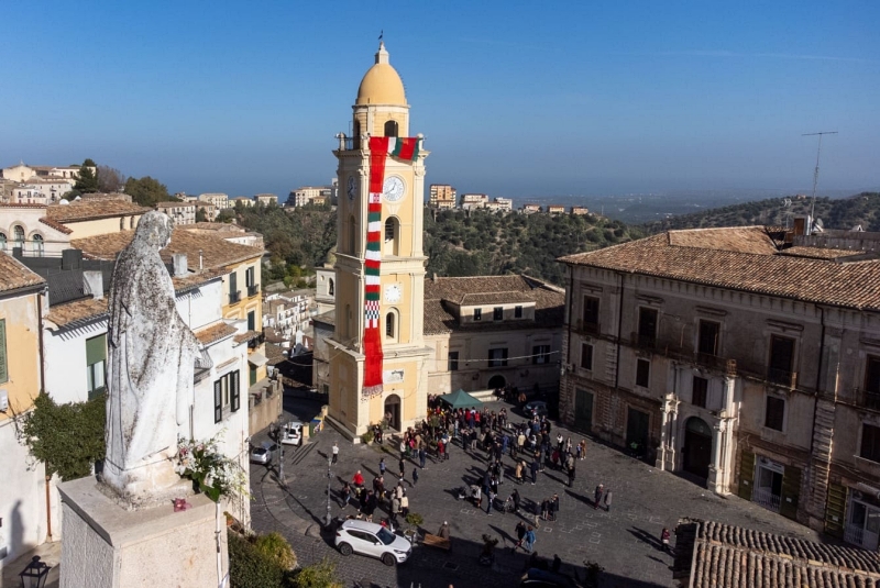 Piazza Steri a Rossano addobbata a festa in modo originalissimo. Una gigantesca sciarpa, riscalda idealmente la torre dell’orologio, luogo simbolo della città.