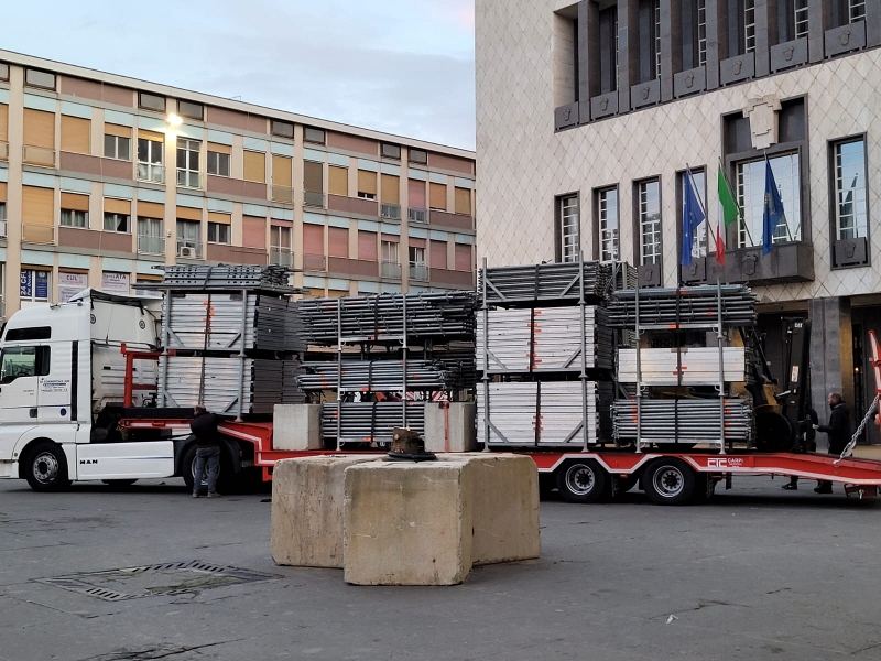 Rimosso il grande albero di Natale davanti Palazzo dei Bruzi, si comincia ad allestire il palco per il concerto che traghetterà la città di Cosenza dal 2022 al 2023.