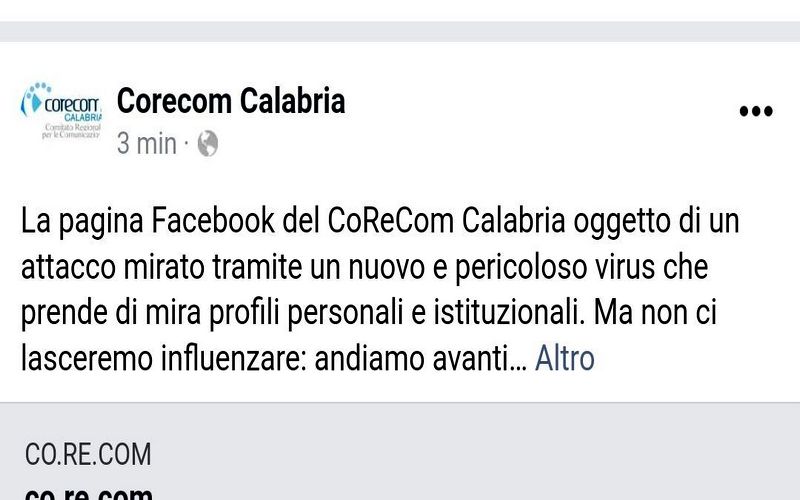 “La pagina Facebook del Co.Re.Com Calabria è stata oggetto di un attacco mirato tramite un nuovo e pericoloso virus che prende di mira profili personali e istituzionali.