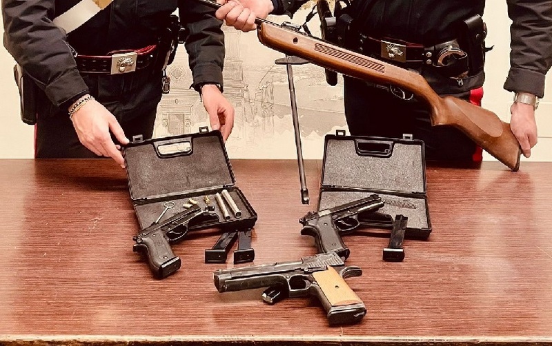 Nel corso dell’attività, gli operanti hanno individuato, abilmente occultati nei cassetti dei comodini della camera da letto e in un locale in disuso posto sul retro dell’abitazione, ma di pertinenza della stessa, numerose munizioni di vari calibri, 3 pistole a salve, strutturalmente modificate, prive del “tappo rosso” e della matricola, nonché 1 fucile del tipo “carabina ad aria compressa”, anch’esso senza matricola e modificato.