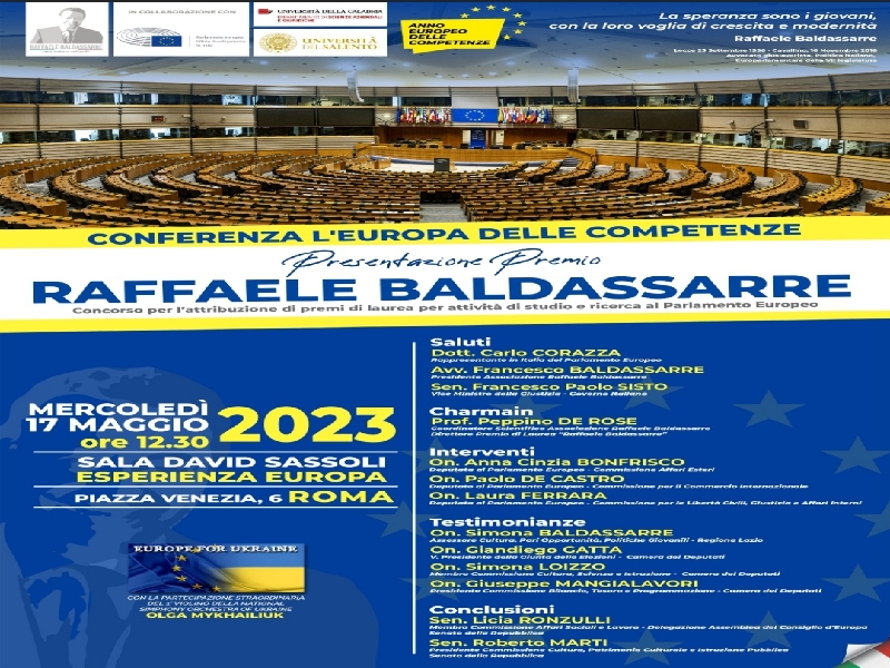 Il 2023 è stato proclamato “Anno europeo delle competenze” sulla scia di quanto annunciato dalla Presidente della Commissione europea, Ursula von der Leyen, nel suo discorso sullo stato dell’Unione 2023 e in base alla proposta adottata dalla Commissione UE. Gli Anni europei sono dedicati ad un determinato tema con l’obiettivo di sensibilizzare i cittadini, incoraggiare il dibattito e il dialogo a livello europeo e nazionale ed è in questa cornice che l’associazione culturale “Raffaele Baldassarre” in collaborazione con la rappresentanza del Parlamento europeo in Italia, ha organizzato la conferenza l’Europa delle Competenze che si terrà giorno 17 Maggio alle ore 12.30 nella sala David Sassoli – Esperienza Europa nella splendida cornice di Piazza Venezia a Roma. Una importante occasione di confronto con esponenti politici europei e nazionali in cui per l’occasione sarà presentato, tra l’altro, anche il primo premio Raffaele Baldassarre, un concorso per l’attribuzione di borse di studio per attività di tirocinio al Parlamento europeo per i laureati in Turismo dell’Università della Calabria e dell’Università del Salento.