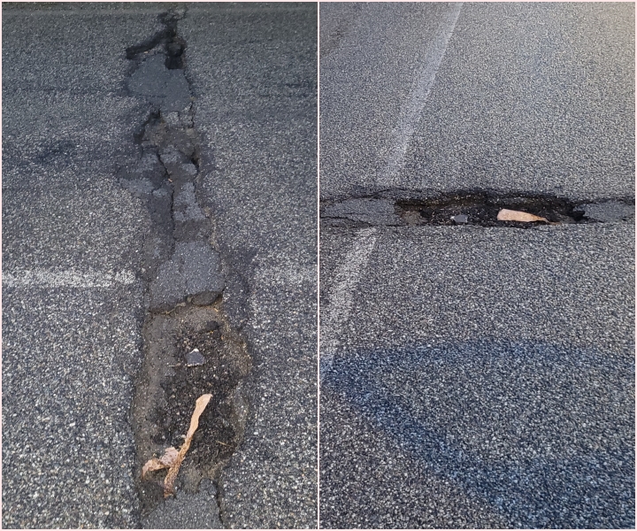 In particolare nel tratto che sovrasta il centro Abitato ( cosiddetta variante) sono evidenti da molto tempo delle voragini sul manto stradale, in modo accentuato sui giunti stradali, che costituiscono un serio pericolo per l’intenso traffico veicolare .