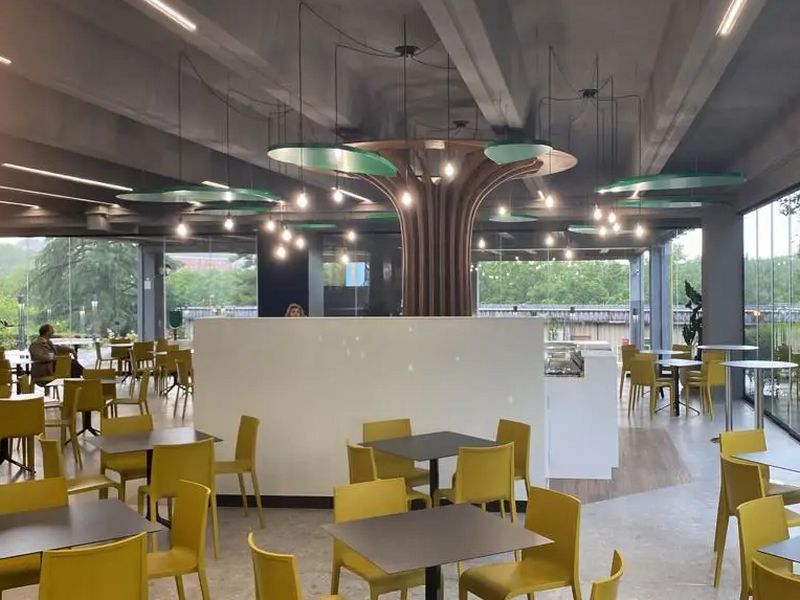Per dare vita al Poli Bistrot è stata necessaria una ristrutturazione e riqualificazione integrale dello spazio bar interno esistente: sono stati per questo realizzati ex-novo 150 posti a sedere, con una nuova sala mensa di 290 metri quadrati che si congiunge con l’area bar di 150 metri quadrati. Per favorire gli incontri e la socializzazione di tutti coloro che vivono quotidianamente il campus, è stato creato un nuovo bar esterno con un’ampia vetrata, che ben si integra con l’area verde esistente, e spazi per la consumazione, insieme a tre terrazze attrezzate da 350 metri quadrati con salottini e panche.
