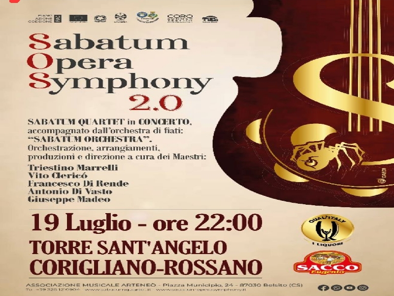 Ecco “Sabatum Opera Symphony”: l’associazione musicale Arteneò, che mira al proseguimento per un progetto orchestrale stabile, annuncia quattro date incentrate sulla riproposizione in chiave sinfonica della musica popolare e di tradizione, dei racconti e delle ballate, con esibizione sui monti (primo anno castelli, secondo anno aree archeologiche e nei luoghi di una Calabria da scoprire).