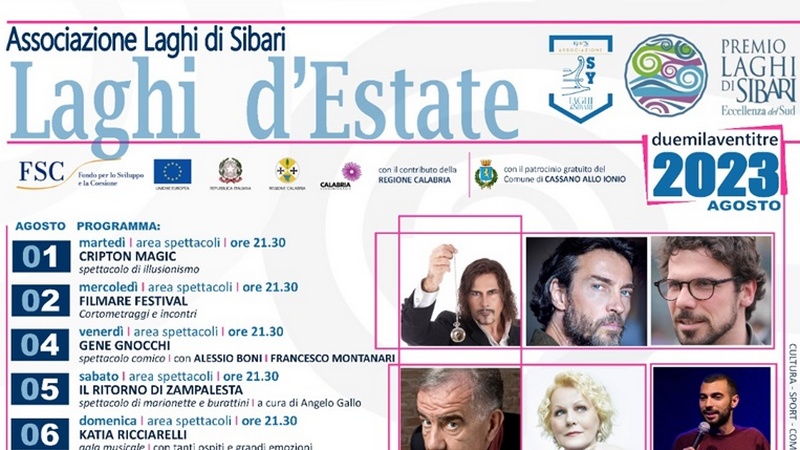 Sarà invece l’area spettacoli a far da cornice agli eventi programmati, tutti con inizio fissato alle 21.30. nell’ordine: lo spettacolo di illusionismo Cripton magic (1 agosto), il Filmare Festival (2 agosto), lo show comico di Gene Gnocchi, Alessio Boni e Francesco Montanari (4), le marionette di Angelo Gallo (5 e 11 agosto), il gala musicale con Katia Ricciarelli (6), la presentazione del libro della scrittrice Nuccia Benvenuto (7), la stand up comedy di Sandro Cappai (8), la tappa regionale di Miss Italia (13), la festa della Madonna dei Laghi (14), la quinta edizione del premio Laghi di Sibari (17), lo show cocking marinaro (18), l’ora delle risate (20 e 21).